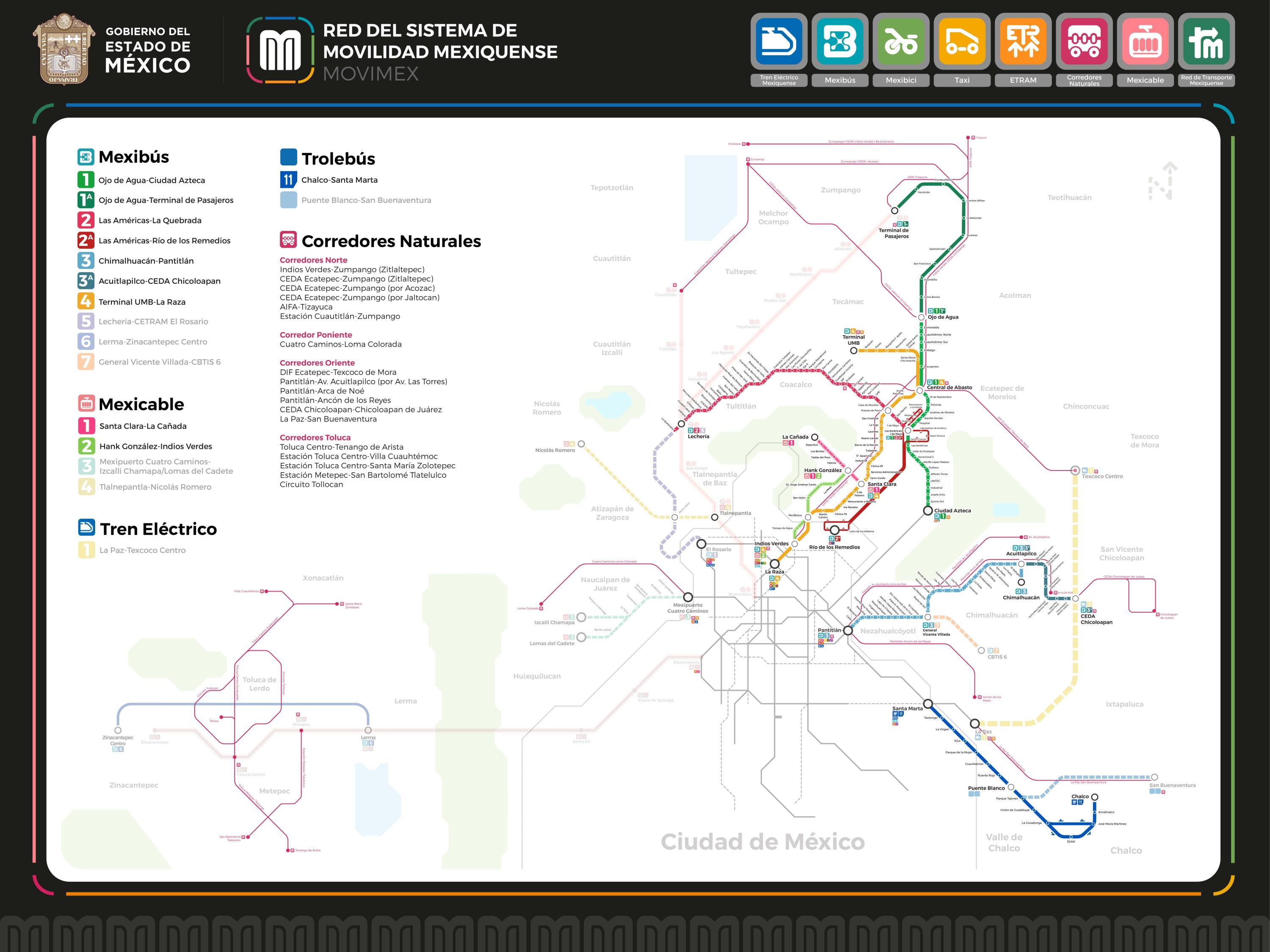 Con el objetivo de ofrecer al usuario información clara y precisa sobre sus trayectos, correspondencias, conexiones y distancias, se crea el mapa MOVIMEX. Este mapa muestra la red de transporte público mexiquense de la Zona Metropolitana del Valle de México y la Zona Metropolitana del Valle de Toluca.